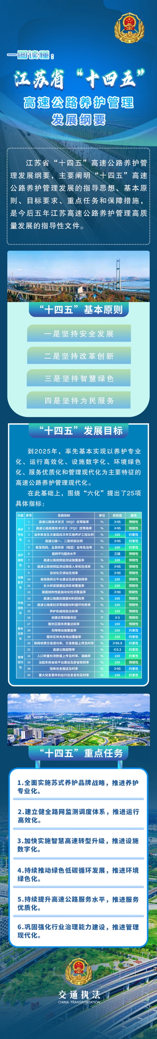 近日,省交通综合执法局印发《江苏省“十四五”高速公路养护管理发展纲要》(以下简称《发展纲要》),明确到2025年要率先基本实现以“养护专业化、运行高效化、设施数字化、环境绿色化、服务优质化、管理现代化”为主要特征的高速公路养护管理现代化,建设安全畅通、智慧绿色、品质高效的高速公路养护管理体系,确保江苏高速公路养护管理水平继续保持全国领先,全力支撑、保障江苏建设交通运输现代化示范区。